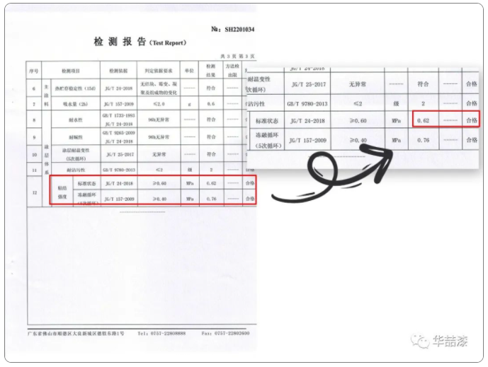 華喆天然真石漆施工后十分堅固,附著力強,其粘結強度測試結果為0.62MPA,符合國家標準粘結強度≥0.6MPA。
