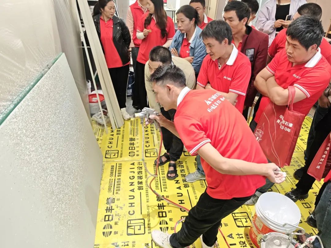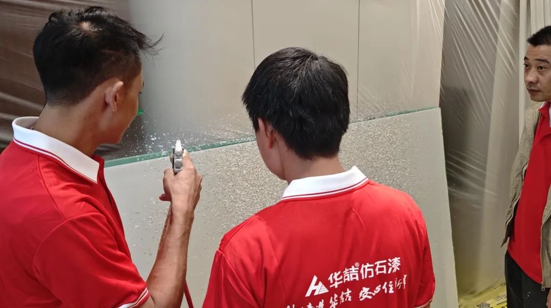 現(xiàn)場施工實操環(huán)節(jié),在華喆技術人員的指導下,油木工們親自上手,體驗了仿石漆的實際施工過程。他們認真操作,仔細琢磨,不僅加深了對施工工藝的理解,還提升了自身的實操能力?,F(xiàn)場氛圍熱烈而有序,每個人都沉浸在仿石漆的魅力之中。