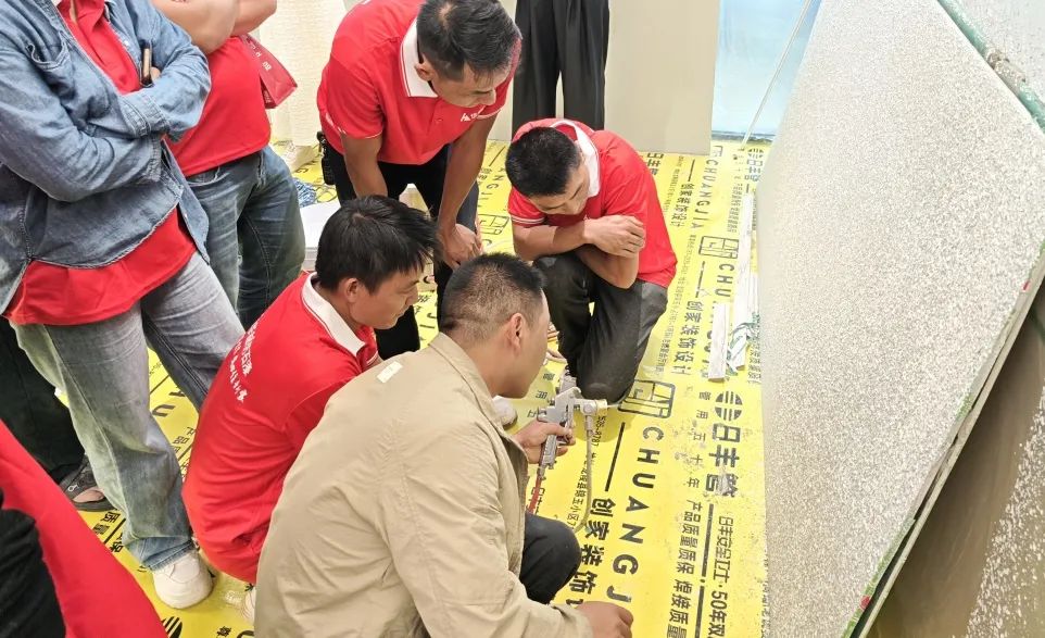 在本次培訓活動的工藝賦能環(huán)節(jié)中,我們?yōu)楝F(xiàn)場師傅們帶來新的筑膜條施工工藝與技巧的分享盛宴。通過融入實際案例的生動講解,深入淺出地講解了仿石漆的施工要點、注意事項以及常見問題的解決方法。油木工師傅們表示,本次分享受益匪淺,對提升施工效率和質(zhì)量有著極大的幫助。