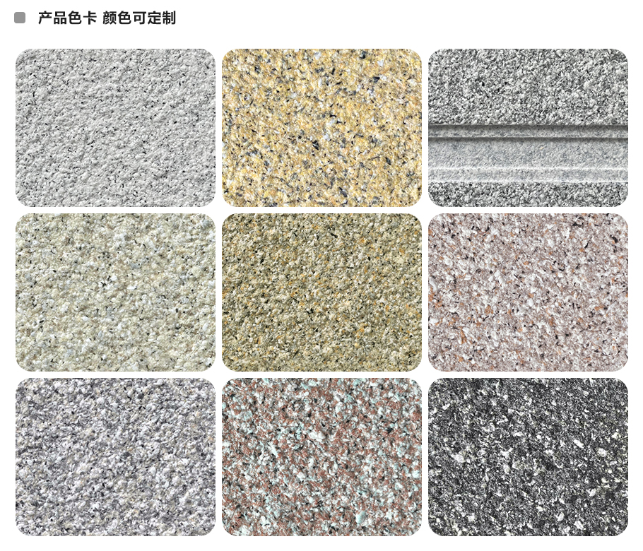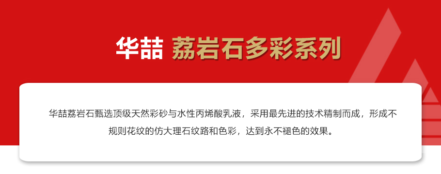 華喆荔巖石甄選頂級天然彩砂與水性丙烯酸乳液,采用先進的技術(shù)精制而成,形成不規(guī)則花紋的大理石紋路和色彩,達到不褪色的效果。